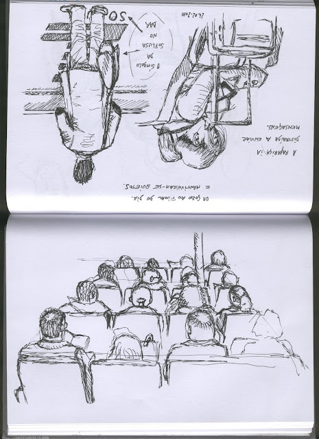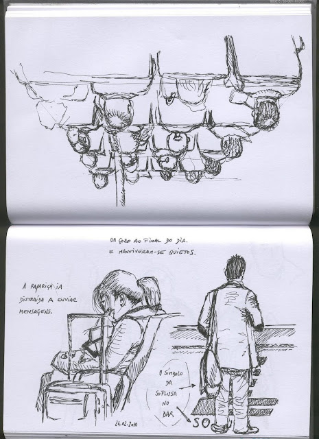 Os dias continuam de chuva, mas não me incomodam, porque continuo a desenhar nas viagens diárias que faço. O rio Tejo e as margens ficam escondidas nas janelas embaciadas, mas encontro conforto nas situações, nas poses que as pessoas mantém enquanto bebem um café ou conversam naqueles 15m de travessia Barreiro-Lisboa-Barreiro.