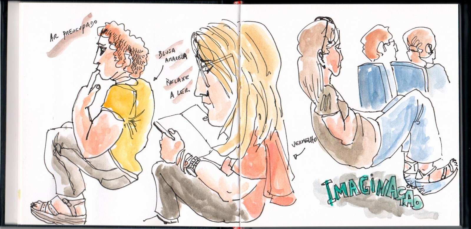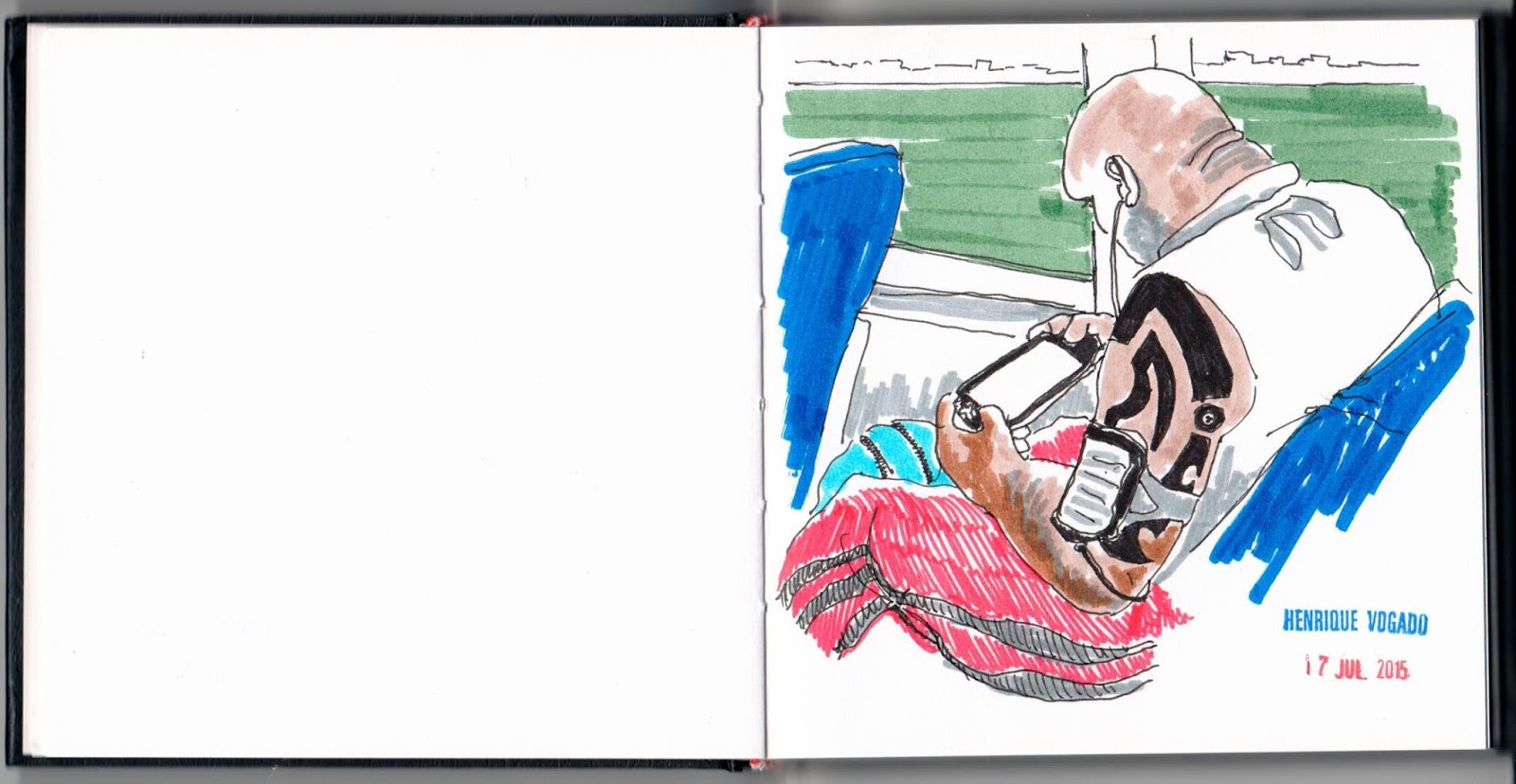 Mais uma distração numa das viagens de barco Lisboa-Barreiro. O desenho da direita acabou por ser imaginado, pois apenas tinha feito a cabeça da rapariga sentada.