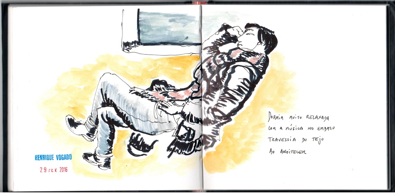 Ao segundo olhar pensei em pegar no caderno e desenhar. Escolhi o ponto de vista e comecei sem saber o que iria ficar em toda folha. Ainda entrou uma janela aberta com o cortinado esvoaçante. Um cenário que afasta todos excepto as moscas, mas que me chamou a atenção e nesse dia ficou no caderno. São registos que ficam apenas no papel, tudo foi limpo no dia seguinte.